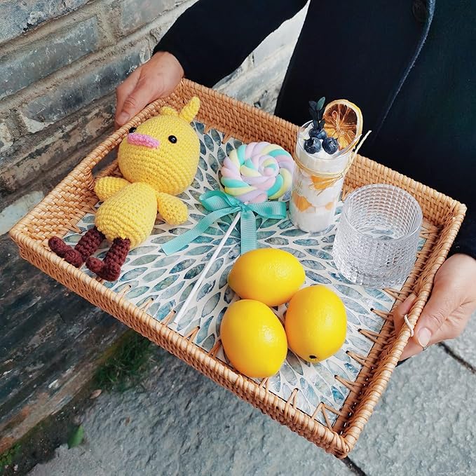 i-lan 14 Inch Rectangular Rattan Woven Tray Basket with Light Blue MOP Wooden Base and Handles, Boho Wicker Coffee Table Serving Tray Décor with 2 Inch Wall, Handmade Display Basket for Dining Room