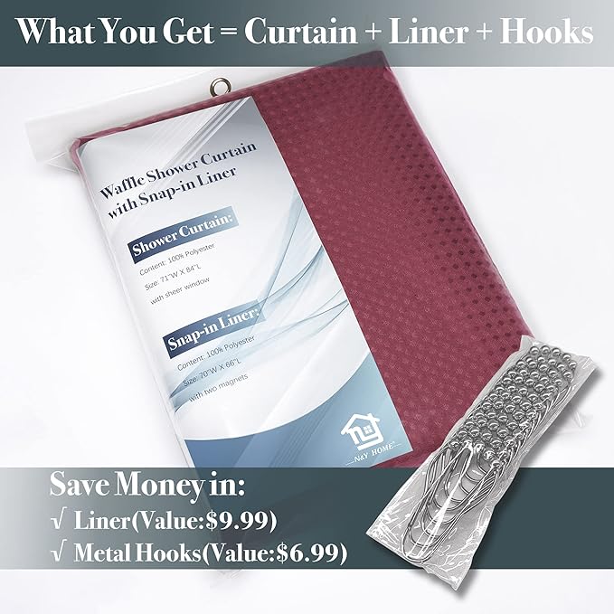 - Smart Design Set & Hotel Style: Waffle weave shower curtain with detachable fabric liner set, and free 12 rust resistant metal hooks, the entire 3-in1 set offers a complete solution for bathroom