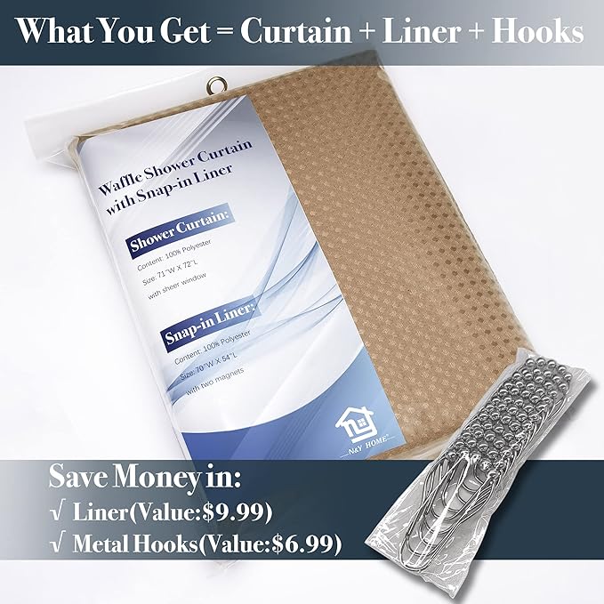 - Smart Design Set & Hotel Style: Waffle weave shower curtain with detachable fabric liner set, and free 12 rust resistant metal hooks, the entire 3-in1 set offers a complete solution for bathroom