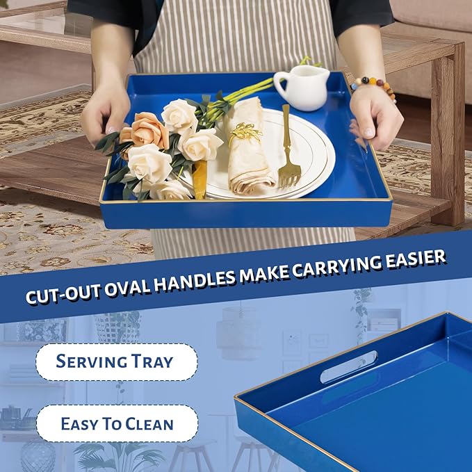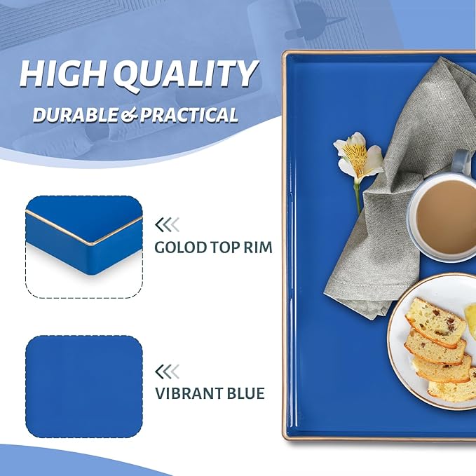 - ELEGANT DESIGN: With a simple solid color finish and golden top rims, the serving tray decorative has a modern and elegant look to create an eye-catching display effect for your items. This chic blue decorative tray can add a touch of color to your room and become a great addition to your home.