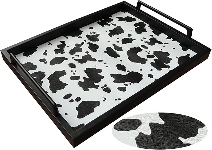 - Black coffee table tray Product size: 16.5*12.6*2.35 inches (L x W x H), weight 2.2 lbs. Materials: PU Faux Leather Cow Texture Wrapped MDF, Black Hardware Handles