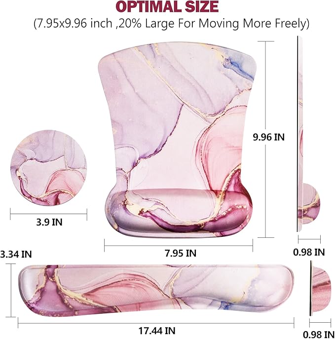 - Optimal Size. Wrist mouse pad (7.95inch x 9.96 inch), keyboard wrist rest support pad (3.34 inch x 17.44 inch), Excellent texture. Designed with an optimal shape and size. Suitable for both man/women. The reinforced edges prevent deformation and damage to long time use. Fit for all kinds of mouse / keyboard.