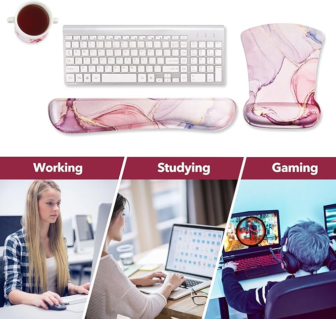 AIMSA Ergonomic Keyboard Wrist Rest and Mouse Pad with Wrist Support Set, Memory Foam Non-Slip Rubber Base, for Home, Office, Easy Typing, Pain Relief, Pink Purple Marble