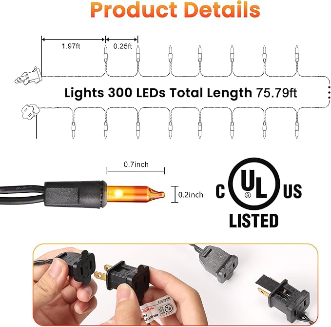 - Safe and Energy-efficient: 120V UL certified, with built-in fuses, safer to use when decorating your Halloween theme party. 300 mini bulbs string lights up to 88% energy savings compared to standard string lights, low power consumption and super bright illumination, perfect decorative for your every unique day.