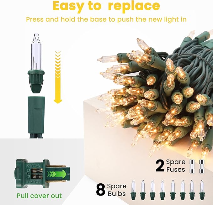 - π Specification & Quality Customer Service: 300 count mini bulbs, 75ft long green wire, the length between 2 bulbs: 3inch. Come with 8 spare bulbs and 2 spare fuses. Toodour provides 30-day money-back and 12-month replacements. If you have any questions, please feel free to contact us.