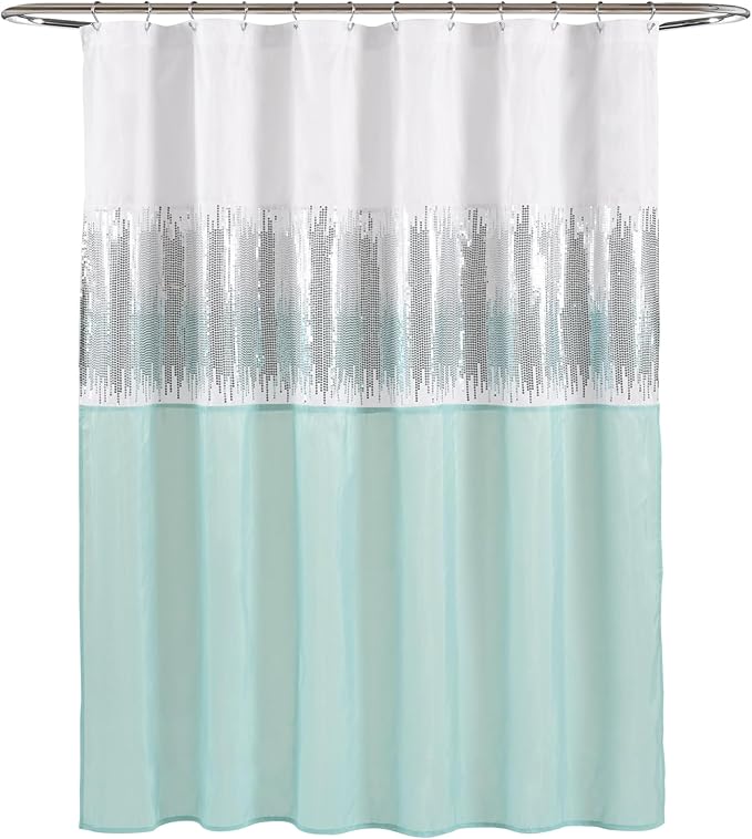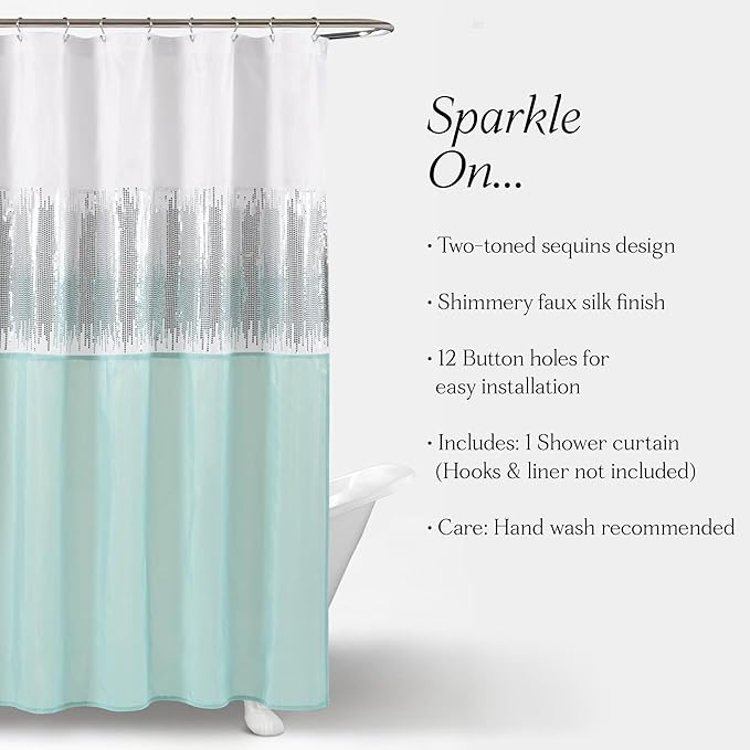 - Modern Glam: Give your home a modern Hollywood glam look with this curtain's shimmery faux silk and sparkling sequins. This glam shower curtain is sure to make a statement in your primary or guest bathroom.