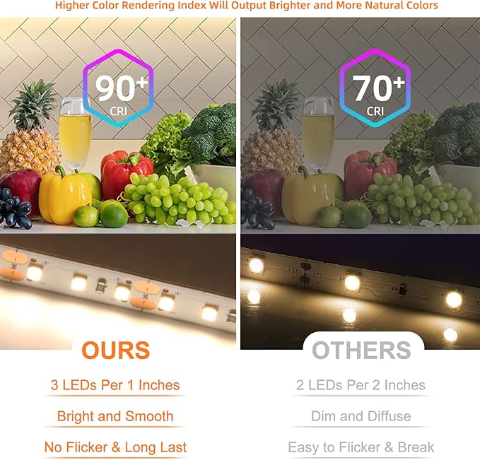 - LED strip lights are flexible that pretty suitable for indoor lighting and decoration.LED lights for bedroom, living room,kitchen,under cabinet,dining room,TV background,mirror,party,stairway,wedding,bar,etc.The color rendering index reaches 90,which is very close to the effect of natural light, can better protect the eyes.