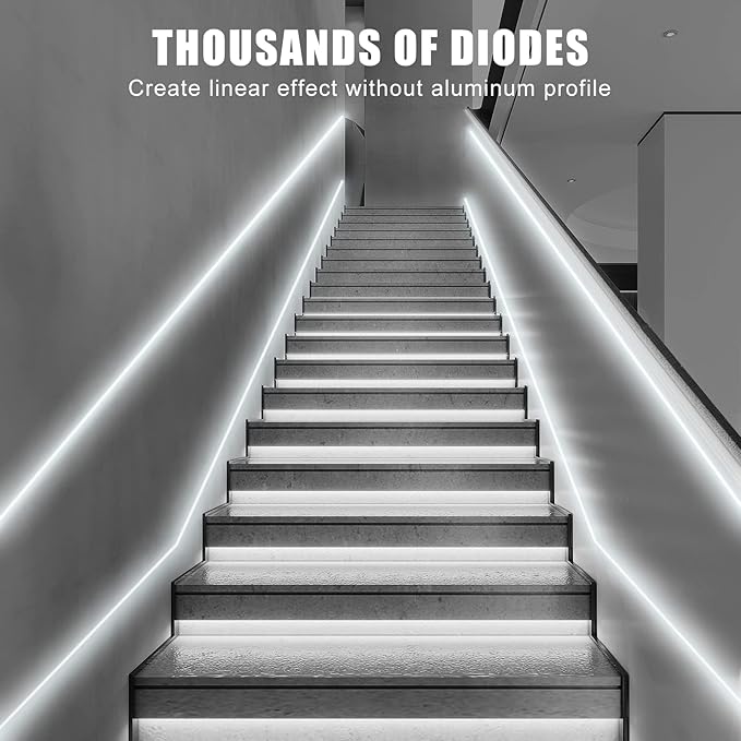 - Create Linear Effect:1920 pcs diodes/16.4ft, 8mm width, no more light dark areas, not reflected off the dark tile or polished counter, great for cosplay effects and model makers