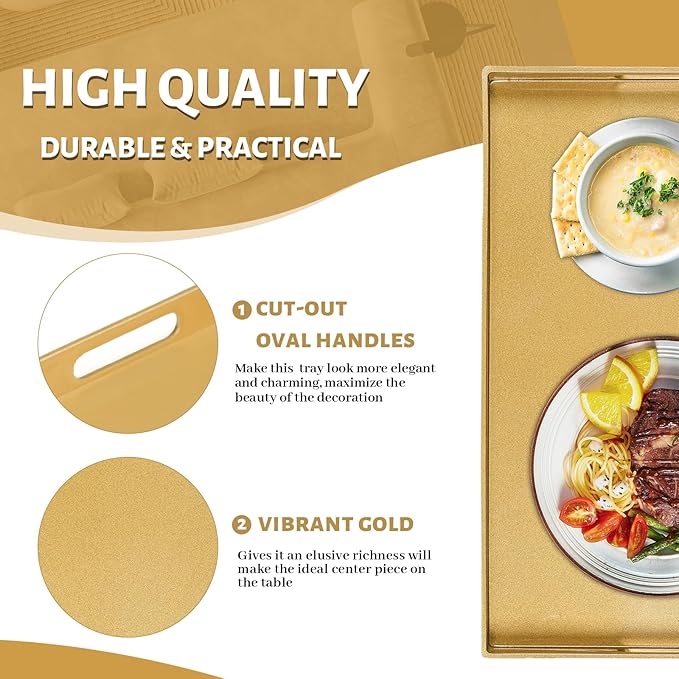- TRAY DECOR: Gold tray is often used to present food and drinks in an appealing and organized manner. Rectangle tray can enhance the visual appeal of the items being served, making them more enticing to guests or customers. Also place it on your bathroom vanity as an exquisite showcase for perfumes, jewelry, or bath accessories.