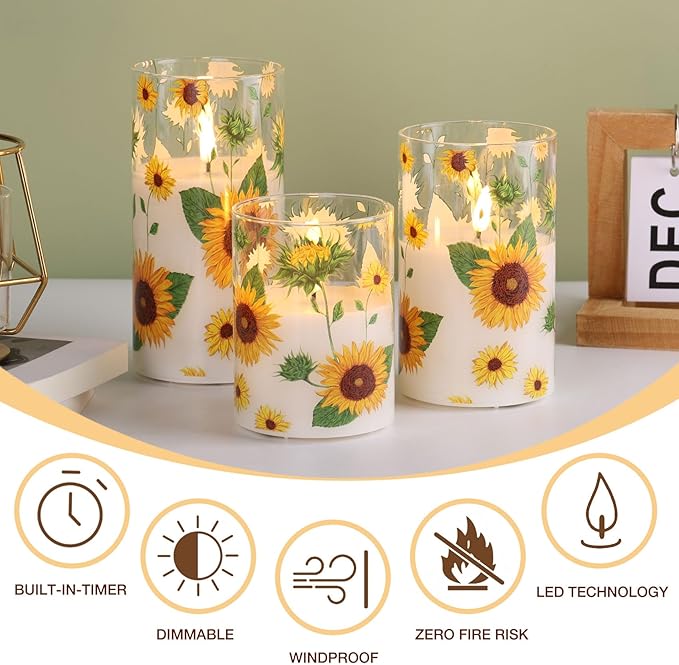 - What You Get - Set of 3 sunflower glass led candles. Each set includes one 3x4 inch, one 3x5 inch, one 3x6 inch glass candles, 1 remote control, one user manual.