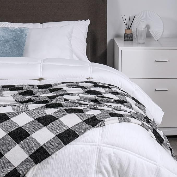 - ELEGANT DESIGN & PERFECT HOME DECOR: Our decorative knitted throw blanket is designed with classical buffalo plaid pattern which can add farmhouse touches to your house. The black and off white checkered pattern makes this chenille woven throw a perfect decor for Halloween and Christmas.