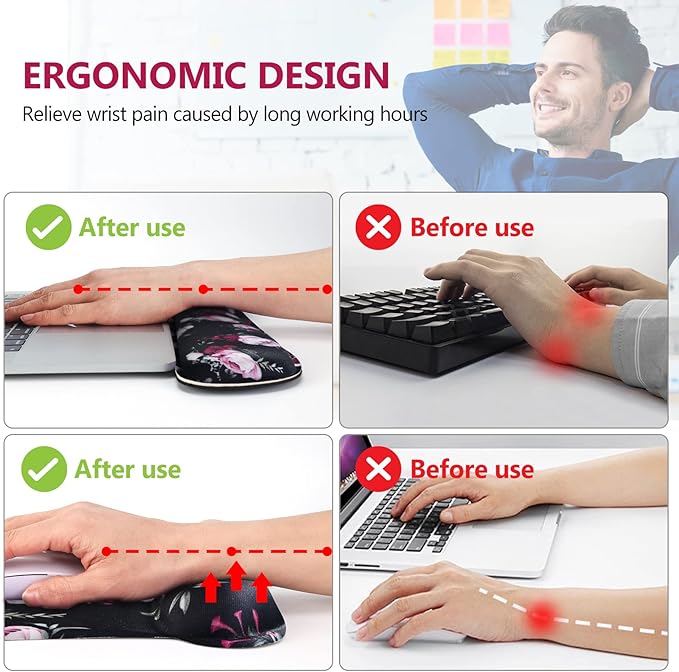 - Ergonomic Wrist Rest Design. The mouse pad set designed with curved shape wrist rest, filled in premium memory foam, keeps your hand in a neutral position for ergonomic comfort, maximum relieve the pain and tiredness to your hand, wrist, elbow, shoulder while typing or playing games. Soft breathable Lycra fabric is smooth and silky, allow the mouse to slide easily.