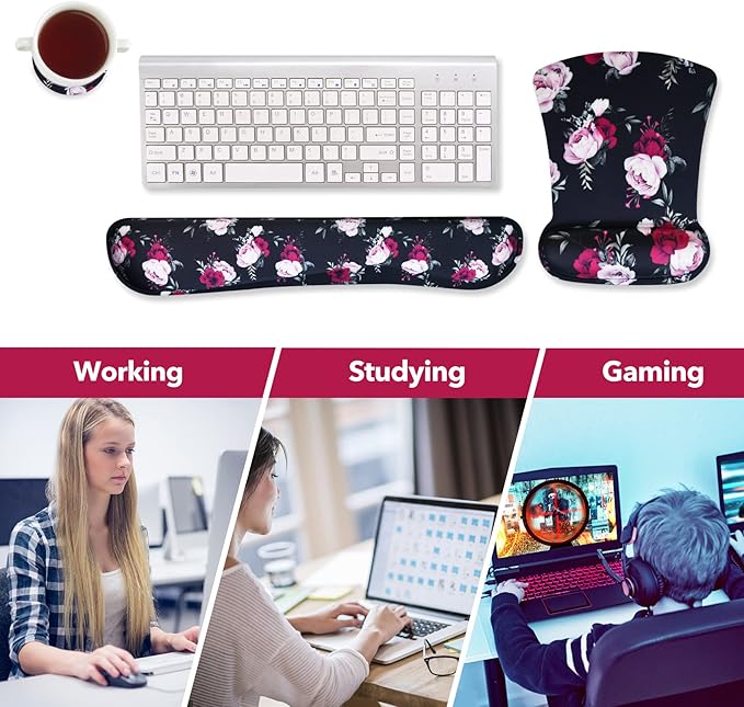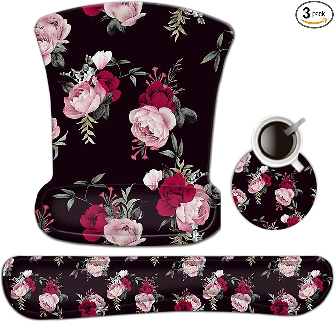 AIMSA Ergonomic Keyboard Wrist Rest and Mouse Pad with Wrist Support Set, Memory Foam Non-Slip Rubber Base, for Home, Office, Easy Typing, Pain Relief, Peony Flowers