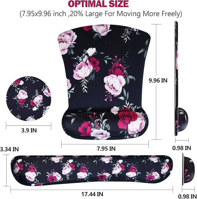 - Optimal Size. Wrist mouse pad (7.95inch x 9.96 inch), keyboard wrist rest support pad (3.34 inch x 17.44 inch), Excellent texture. Designed with an optimal shape and size. Suitable for both man/women. The reinforced edges prevent deformation and damage to long time use. Fit for all kinds of mouse / keyboard.