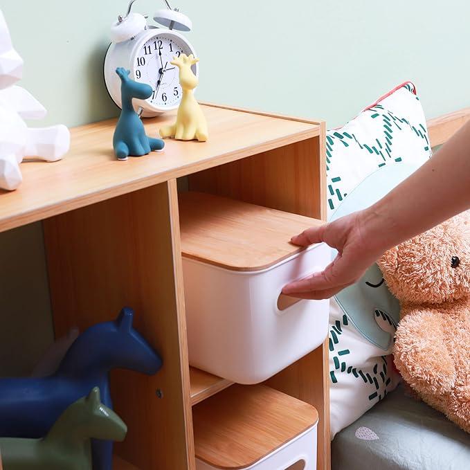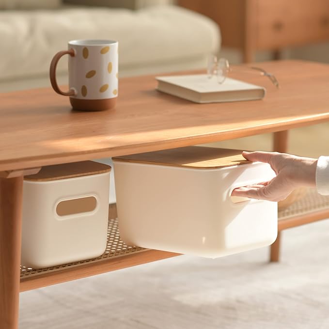 - 【Perfect Size for Daily Storage】Including 2 plastic storage bins with bamboo lids, single measuring: 10.24"L * 7.01"W * 6.1"H.