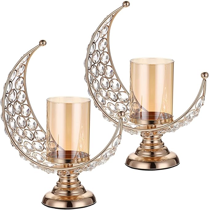 OwnMy Set of 2 Gold Moon Shaped Crystal Pillar Candle Holders Tealight Holders with Glass Covers, Metal Crystal Moon Pillar Candle Stands Votive Candlesticks Candle Lamps for Table Centerpieces