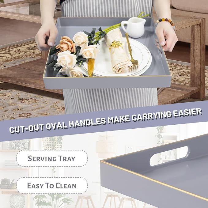 MAONAME Decorative Tray, Gray Serving Tray with Handles, Coffee Table Trays, Square Plastic Trays for Ottoman, Bathroom, Kitchen, 13"x13"x1.57"