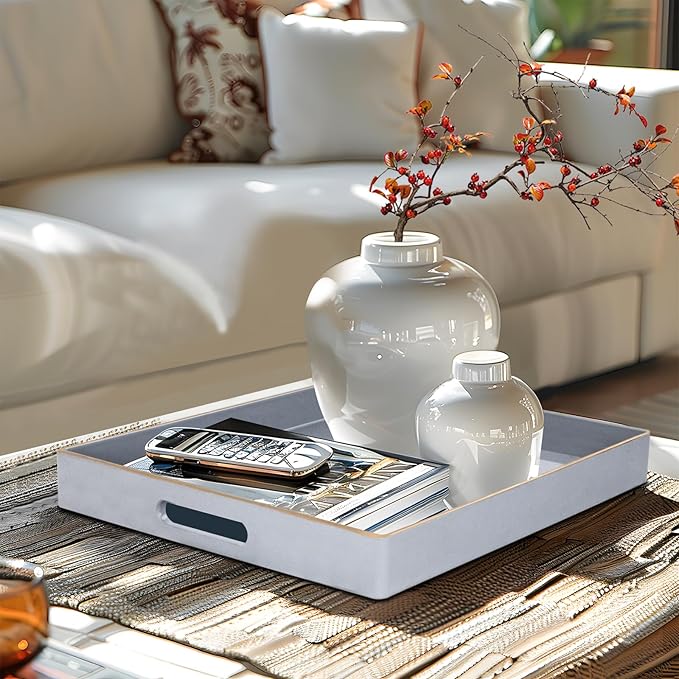 - PLASTIC TRAY WITH HANDLES: The decorative coffee table tray is equipped with two built-in hollow handles and elegant sides, which canprevent items from falling, also easily carry the square decorative tray wherever you need it. The surface of the tray is smooth and easy to wipe with a damp cloth or rinse with warm water.