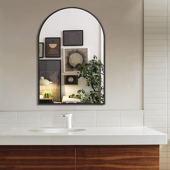 - ARCHED DESIGN: Wall mirror has a classic arch shape with a shatterproof design. It can be hung on the wall or placed on tabletop and is suitable for a variety of home styles such as modern, classical, boho. Product size 24'' x 36'', matte black.