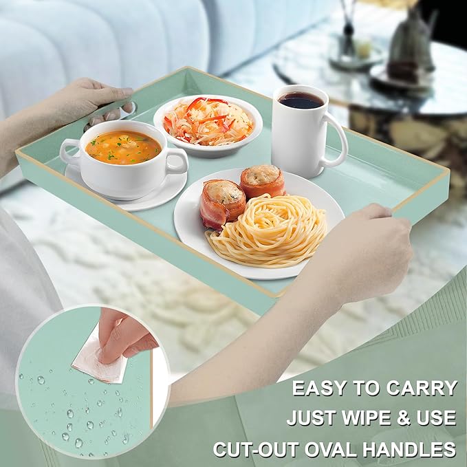 - TRAY DECOR: Mint green tray is often used to present food and drinks in an appealing and organized manner. Rectangle tray can enhance the visual appeal of the items being served, making them more enticing to guests or customers. Also place it on your bathroom vanity as an exquisite showcase for perfumes, jewelry, or bath accessories.