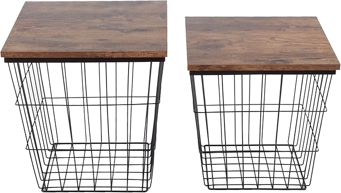 End Tables Set of 2 - Nesting Tables with Removable Wood Tops and Metal Basket Bases for Blanket Storage - Square Side Furniture for Living Room, Bedroom, or Home Office by Lavish Home (Brown)