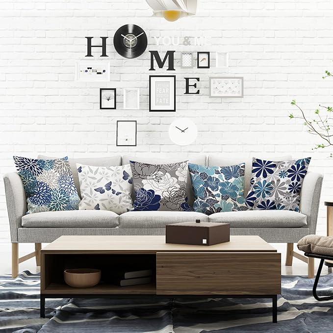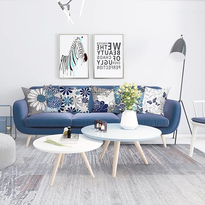 - Set of 6 blue daisy patterned cotton linen decorative pillow covers with invisible zipper closure