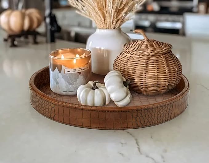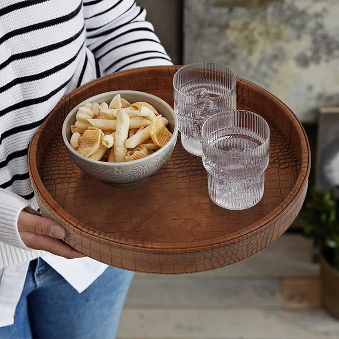 - Combining a chic round shape with antique brown croco faux leather finish, these serving trays make a stylish yet understated accent suitable for a wide range of settings. Sturdy, non-slip and lightweight material to make the wood tray use-friendly. Perfect decoration for your house.