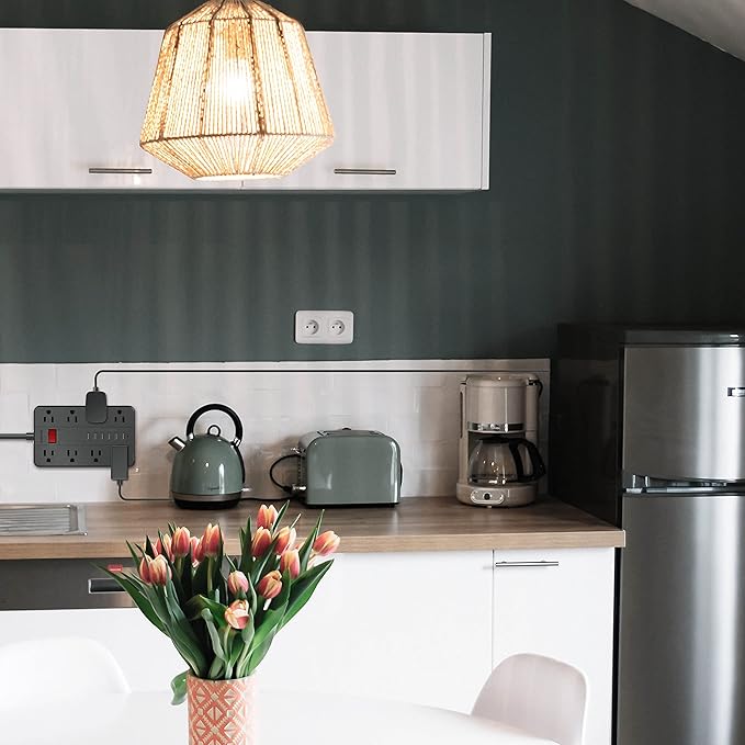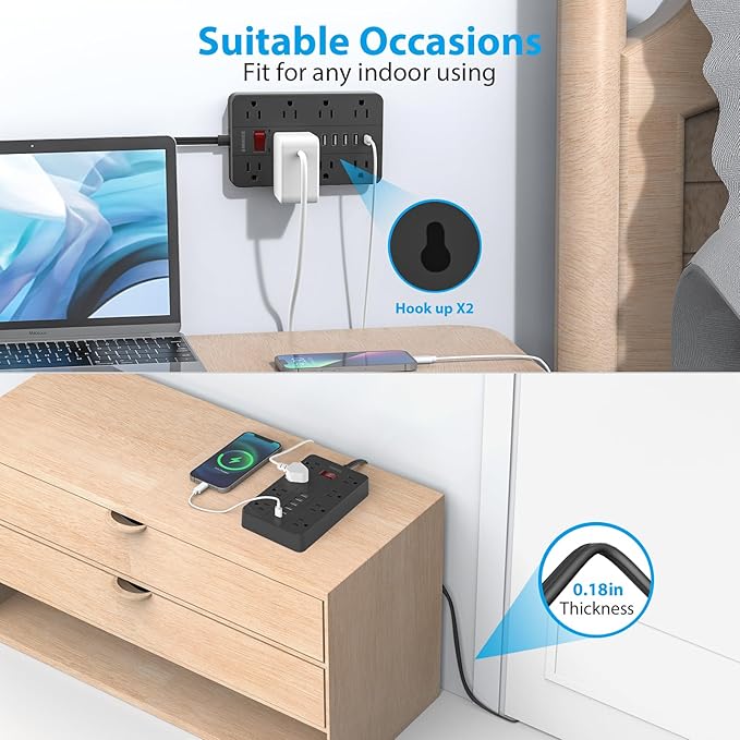 - Widely Spaced Outlets Fit for Big Plugs:8 AC power sockets are designed to be wider, so the power adapters will not interfere with each other,Ideal for multiple devices charge together, whether as a desktop power strip or a nightstand charging station, it can be competent.