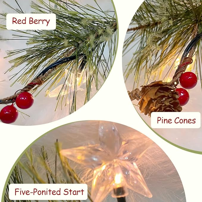 - Nature's Beauty:Inspired by nature's elegance, our thin christmas garland with lights is adorned with smokey pine needles, starts, pine cones, red berries