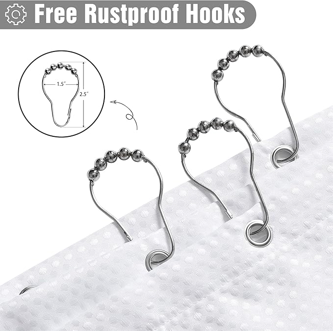 - Packaging and Care Instructions: Includes 1 shower curtain with reinforced meta eyelets. 12 rustproof hooks with silver ball beads for easy sliding on the shower curtain rod.
