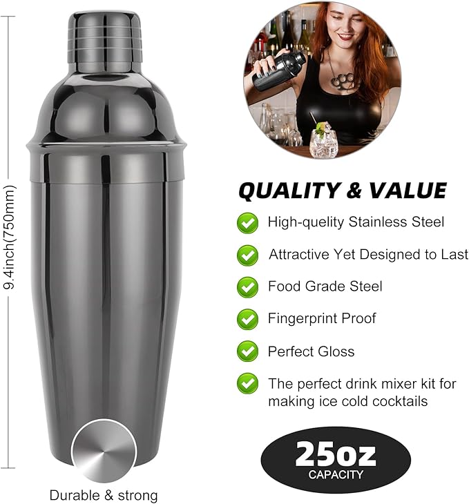 - 🍸【Premium Stainless Steel Material】 Cocktail shaker set is made of premium 304 stainless steel material. Harmless to health, is durable, leak-proof, lightweight, and non-scratchable, rustproof, and resistant to scratches, not deformed, and easy to clean. cocktail shaker bar tools set is very easy to clean by hand with warm soapy water and keep their shine with ease, Adding modern art to your home bar.