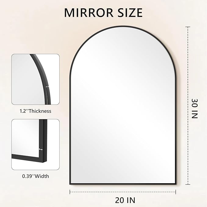 - Modern and Elegant Design: This matte black wall mirror is perfect for Bathroom, Entryway, Bedroom, Living Room decoration. Mirror size is 30'' x 20'',Arched shape.