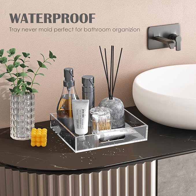 Home Decorative Coffee Table Tray, 10"x10" Elegant Acrylic Serving Trays with Handles Works for Eating, Breakfast, Makeup Drawer Organizer,Bathroom Vanity Table,Ottoman Tray, Clear