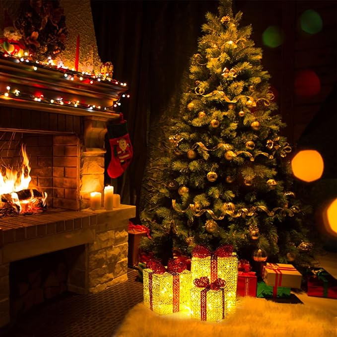 Sunnyglade 7.5”-5.9”-4.7” Set of 3 Christmas Lighted Gift Boxes with Bows Present Boxes for Christmas, Weddings Yard Home Holiday Art Decorations (Gold)