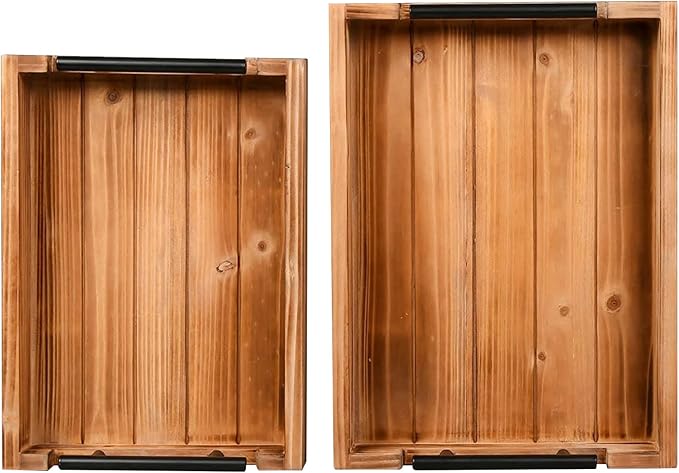- ✅Stackable Design Easy to carry – these serving trays are both durable and light weight. the thick and sturdy,DURABLE IRON HANDLES. Designed with iron handles, these rustic nesting trays combines antique looks and convenience. The sturdy metal handles makes the transporting foods and drinks safely and securely.