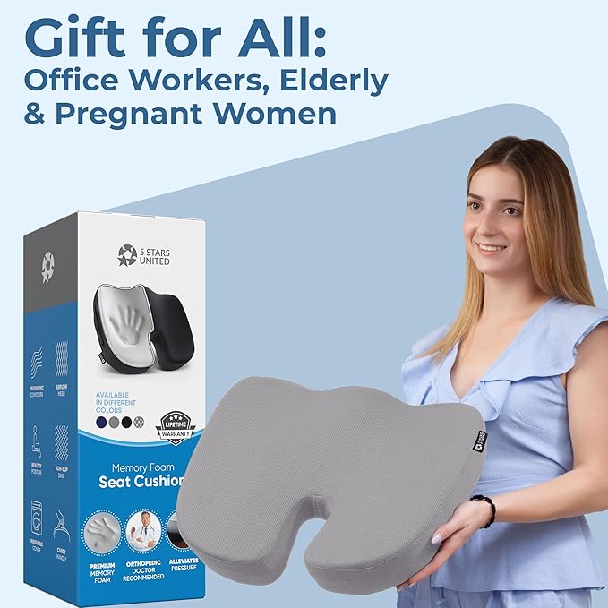 5 STARS UNITED Seat Cushion for Tailbone Pain Relief โ Memory Foam Cushion for Coccyx, Hip, Hemorrhoid, Sciatica & Post-Surgery Recovery โ Wheelchair, Car, Desk, Gaming & Office Chairs, L Gray