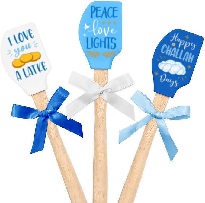 - Hanukkah Silicone Spatula Set: There are 4 items in the package. 1 is "Light it up" silicone spatula with a baby blue ribbon bow, 1 is "Oy, to the world" silicone spatula with a white ribbon bow, 1 is "dreidel dreidel dreidel" silicone spatula with a dark blue ribbon bow and the last one is an Happy Hanukkah greeting card. We add the classic elements like dreidel, menorah and star in the design
