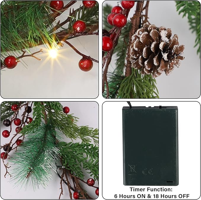 - 6 FT Lighted Christmas Garlands: Our Christmas garland measures 6 ft, decorated with mixed decorations like pine cones and red berries, provides you with a lot of freedom to use it wherever you please. This artificial garland will light up your holidays, for both indoors and outdoors!