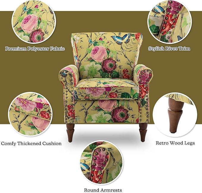 - Charming Furniture Addition: With beautiful floral patterns and wingback design, this chair showcases a charming appearance, while wooden legs and retro rivet trim create a sense of retro timeless style to your home decor. You can put this chair in your living room, bedroom or office.