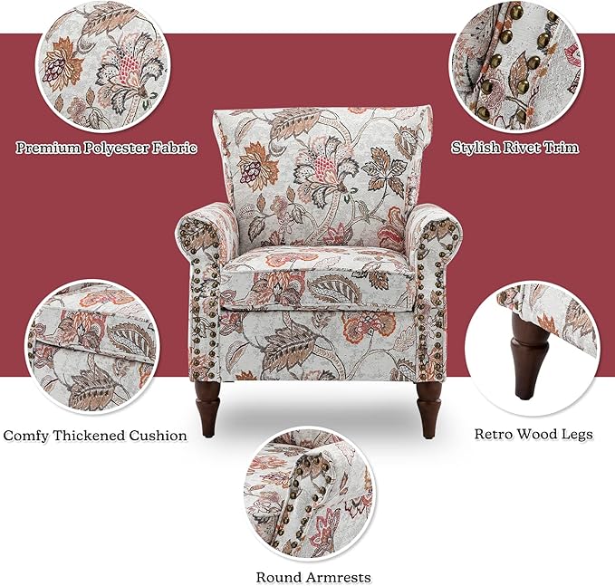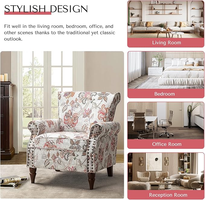- Charming Furniture Addition: With beautiful floral patterns and wingback design, this chair showcases a charming appearance, while wooden legs and retro rivet trim create a sense of retro timeless style to your home decor. You can put this chair in your living room, bedroom or office.