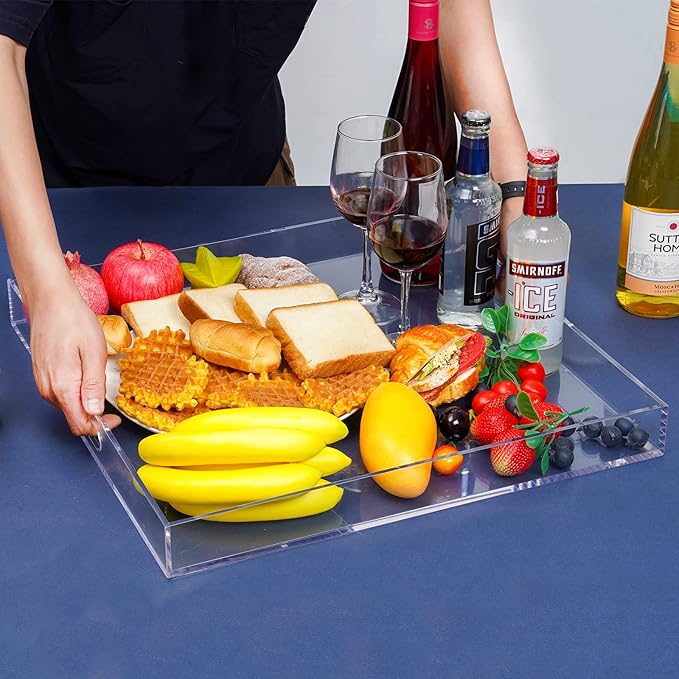 18×18 Inches Clear Acrylic Serving Tray with Handles Extra Large Ottoman Tray Decorative Trays Spill-Proof Coffee Table Space Saver Oversize Counter top Organizer Platter with Safe Edge