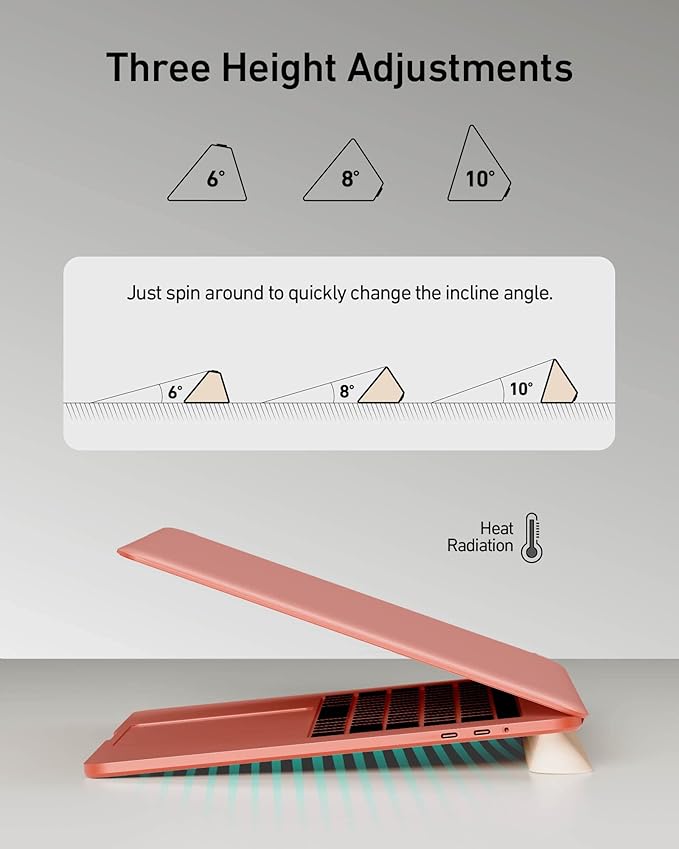 - ใThree Ergonomic Anglesใ Available in incline levels 6ยฐ, 8ยฐ, and 10ยฐ, which are rational heights for reading and typing, this laptop cooling stand can alleviate posture-related problems such as muscle, wrist, and repetitive strain injury.
