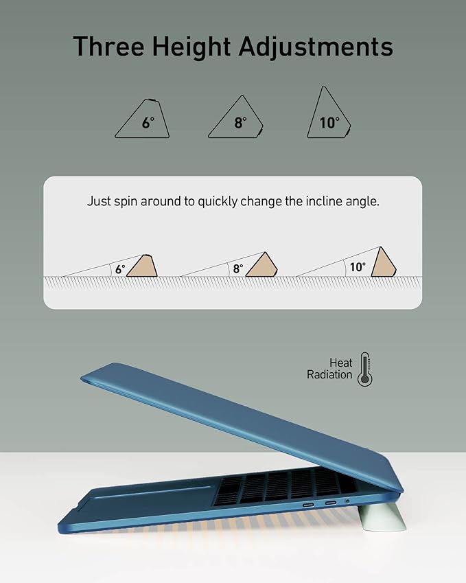 - ใThree Ergonomic Anglesใ Available in incline levels 6ยฐ, 8ยฐ, and 10ยฐ, which are rational heights for reading and typing, this laptop cooling stand can alleviate posture-related problems such as muscle, wrist, and repetitive strain injury.