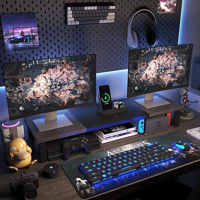 - 【Monitor Stand for 2 Monitors】This stand is an ideal choice when you need computers to work together. Unique original design,patented products,this dual-monitor stand features a sturdy construction black with a rustic brown wood finish for an added rustic and unique look.