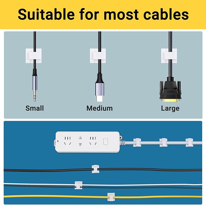 - Self-Adhesive -- Cord Clips have PE foam double-sided super adhesive tape at bottom, firmly grip cords on different types of surfaces. Tips: leave about 24 hours before using shall make it will better bond with wall surface.