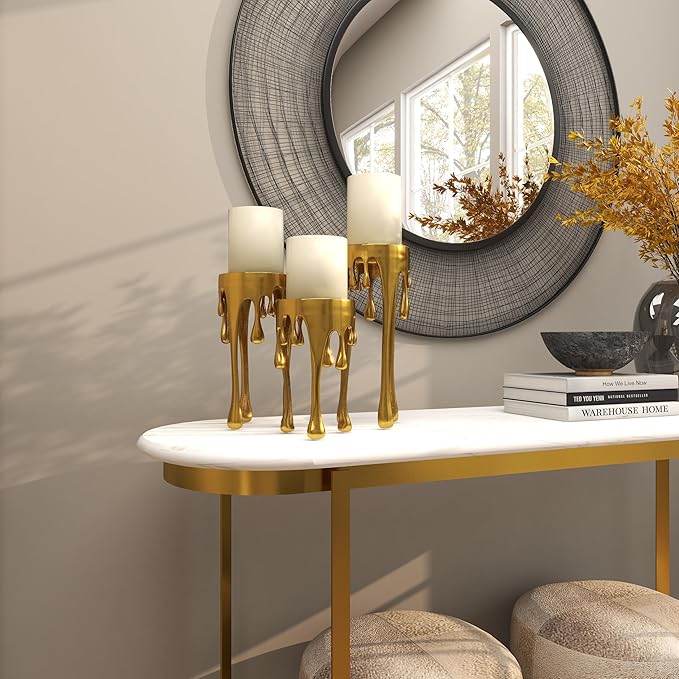 CosmoLiving by Cosmopolitan Aluminum Metal Abstract Decorative Candle Holder Melting Drip Candle Stand, Set of 3 Candlestick Holder 12", 10", 8"H, Gold