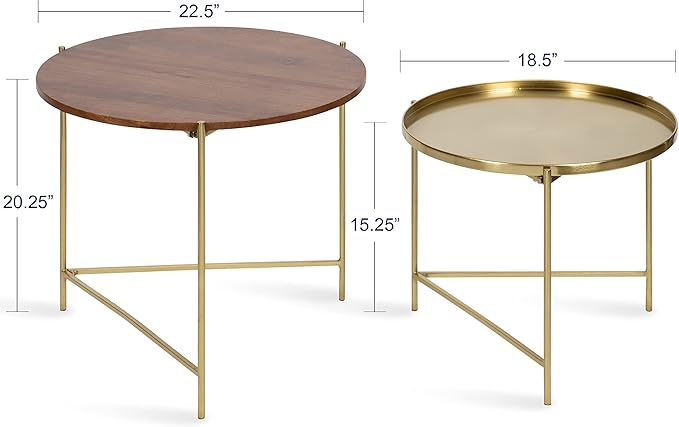Kate and Laurel Ulani Modern Nesting Coffee Table; Set of 2; Walnut and Gold; 22.5 x 20.25; Decorative Sophisticated Mango Wood and Metal End Tables for Display and Storage