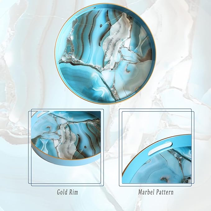 Spsyrine Round Decorative Tray, 13" Plastic Marbel Serving Tray with Handles for Breakfast, Ottoman, Coffee Table, Bathroom, Kitchen, Living Room