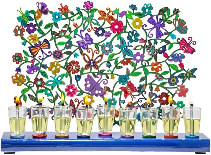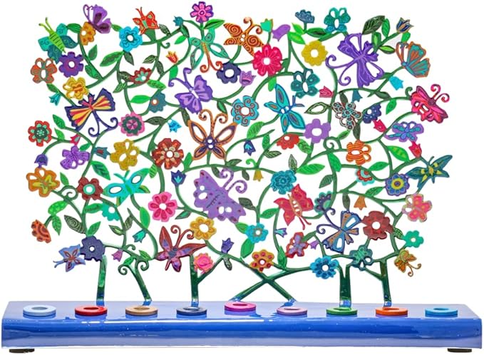 - UNIQUE AND COLORFUL DESIGN - Yair Emanuel combines modern design and illustrations inspired by traditional art from the Holy land. The Menorah features classic depictions and motifs from Judaism such as Jerusalem, The tree of Life as well as recurring themes by the artist such as butterflies, flowers and birds