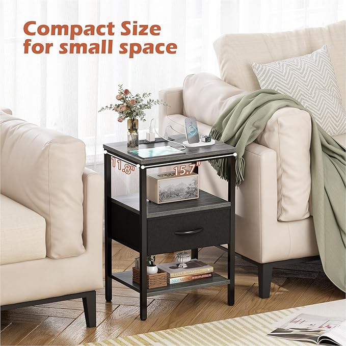 - 【Go for a Long Time】: Charcoal gray wooden grain shelves blend black fabric and metal frame, making it a timeless classic. Sturdy P2 particle board, sturdy metal frame, and durable fabric drawer, all these work excellently to give this side table with charging station strong support